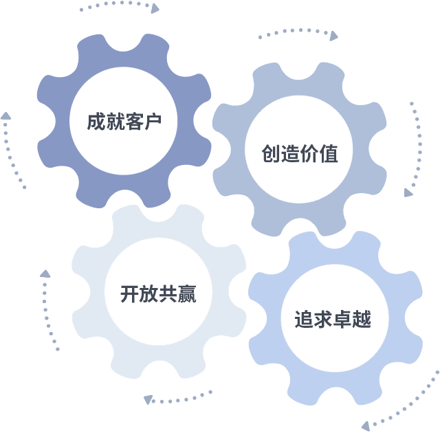 成就客户是一切决策的出发点,,创造价值是衡量所有工作的标准,,,追求卓越是我们做事做人的态度,,,开放共赢是我们的格局也是最终的结果。。。价值观的齿轮环环相扣,,,推动着组织里的每个人不断向前。。。。