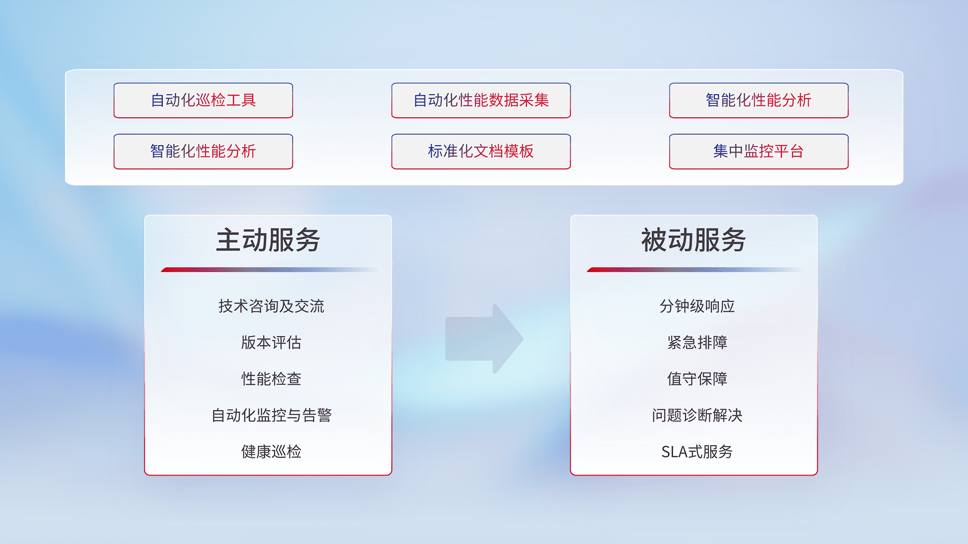 智能化工具和标准化文档,,,,保障服务质量,,,提供主动服务(包含技术咨询、、、版本评估、、、、性能检查、、、自动化监控与告警、、、健康巡检)和被动服务包含(分钟级响应、、紧急排障、、值守保障、、问题诊断解决、、、SLA服务)。。。。